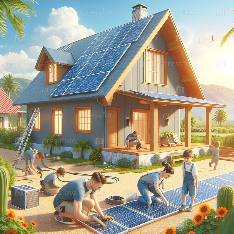 Семья устанавливает солнечные батареи в свой экологически чистый дом, солнечный день