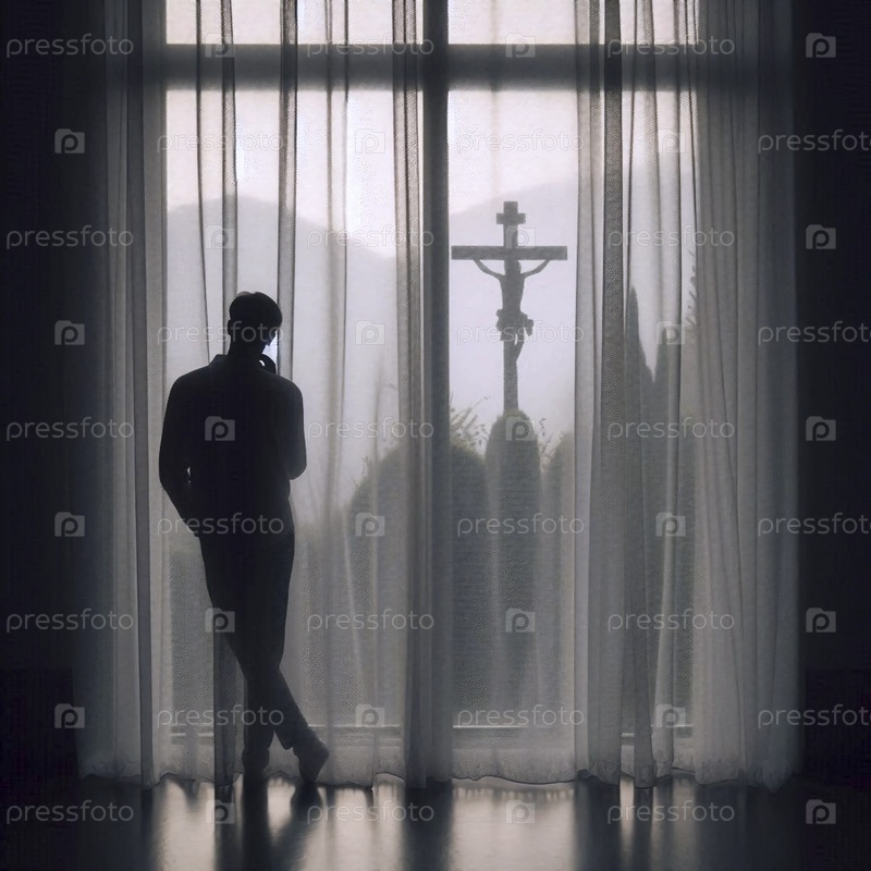 Силуэт распятия, увиденный через простую завесу с фигурой, Ай создал изображение