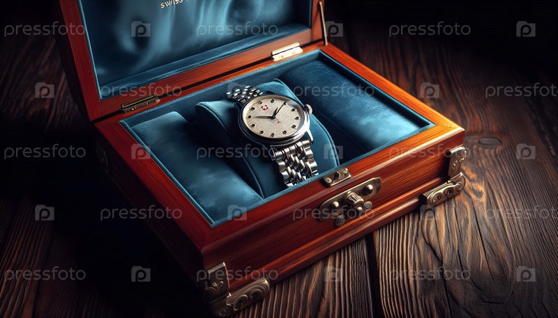 Швейцарские часы в деревянном витрине, изображение создано AI