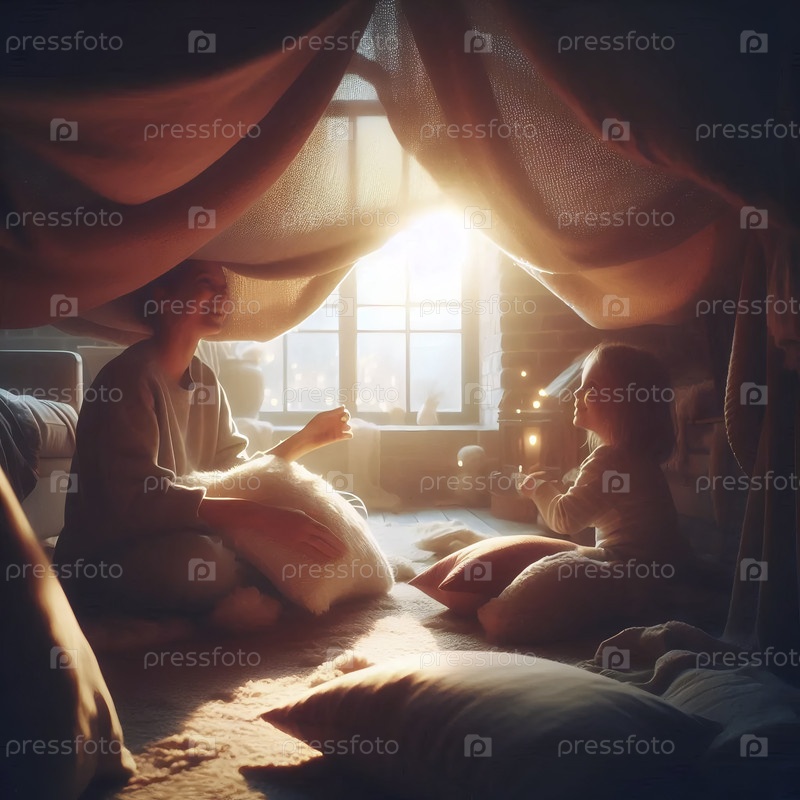 Семья, строящая разветвленную и сложную ковровую крепость в гостиной, захваченная изнутри форта, создала образ Ай