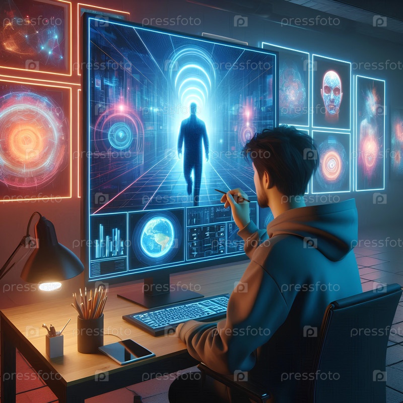 Художник демонстрирует цифровое искусство NFT в виртуальной галерее, неоновые огни