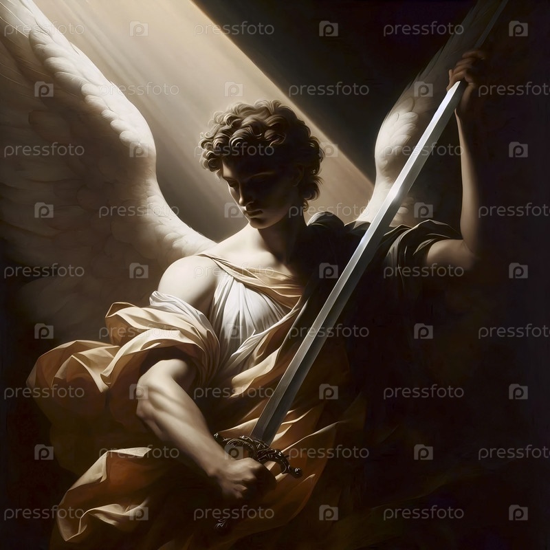 Ангел как небесный воин, Караваджо chiaroscuro, Ai generated image