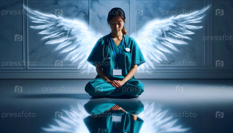 Усталая медсестра с полупрозрачными ангелскими крыльями в коридоре больницы, Ai generated image
