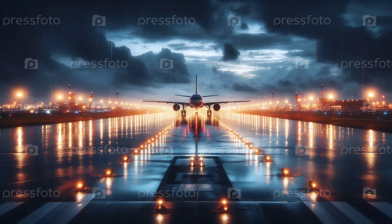 Взлетно-посадочная полоса с освещенными огнями в дождливую погоду, Ai generated image