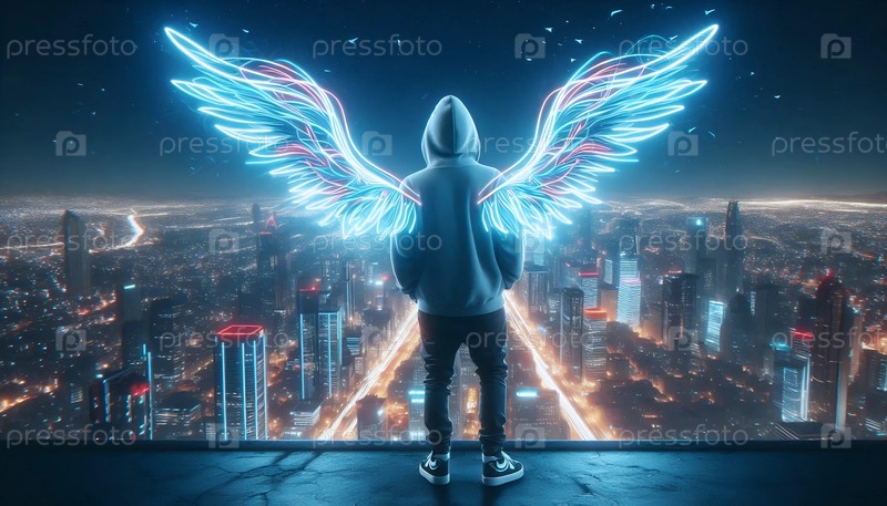 Современный ангел в городской уличной одежде, летящий над мегаполисом, Ai generated image