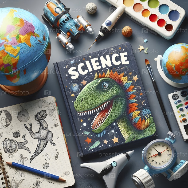 Детская книга с научной тематикой о космосе или динозаврах, размещенная рядом с мини-глобусом, Ai created image