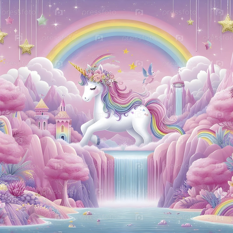 Magical unicorn kingdom детская комната обои с радужными водопадами и блестящей звездой , Ai created image