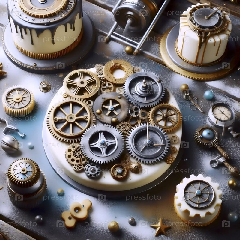 Дисертационное искусство, вдохновленное стемпанком с использованием печенья в форме коробки передач и тортов с металлической пылью, Ai created image