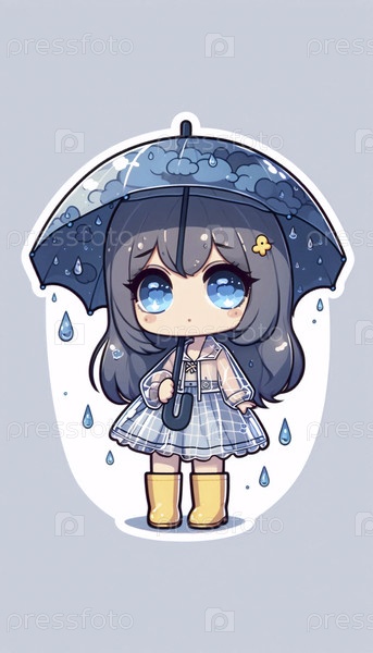Красивый стикер kawaii с девушкой в дождливые дни, Ai generated image
