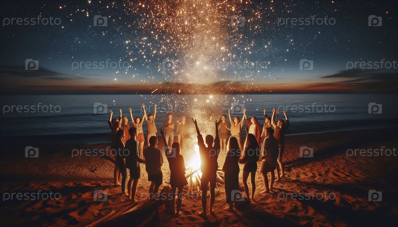 Группа друзей собралась вокруг трескающего костра на темном, отдаленном пляже, их лица были освещены пламенем под звездным небом