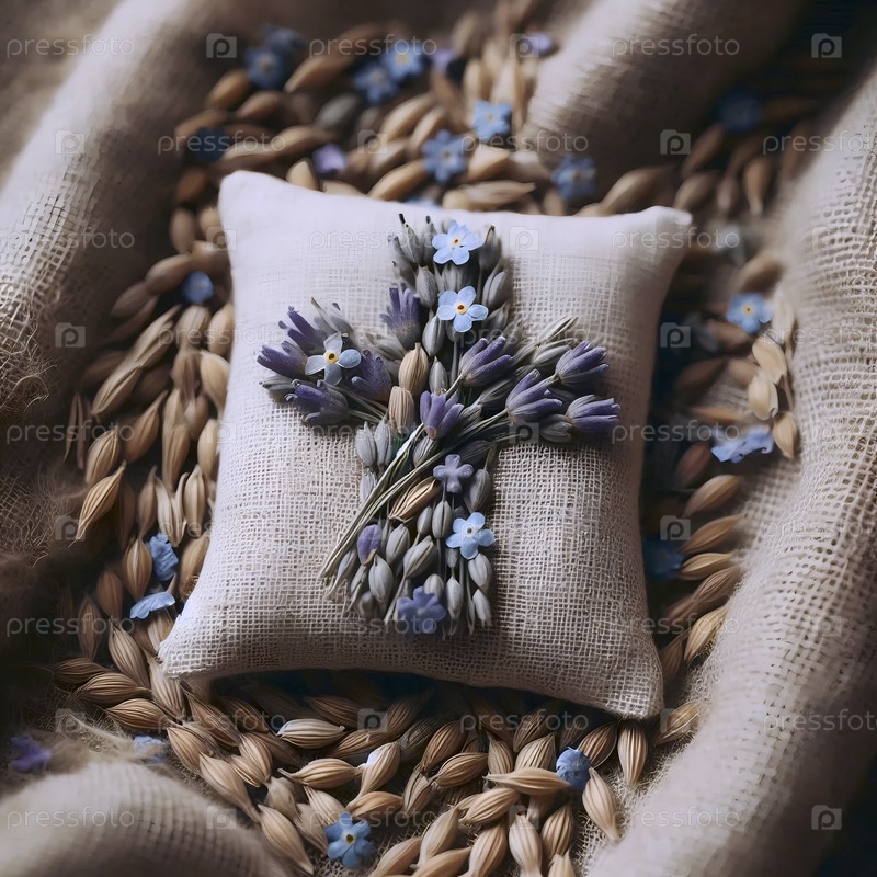 Лавандовый мешок с прессованным цветочным крестом на льне, Ai generated image
