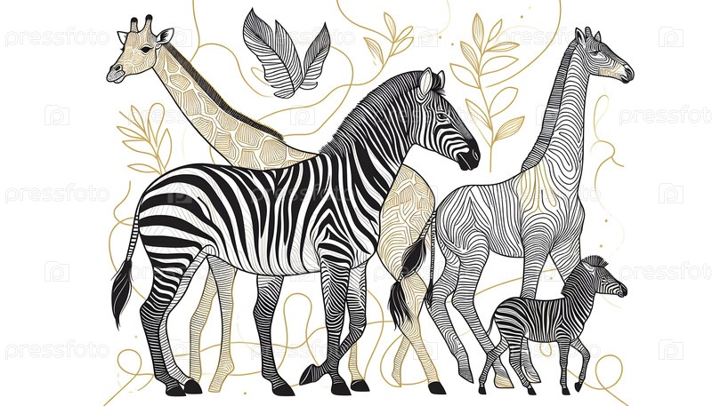 Черно-белый живописный рисунок с линиями животных детская комната обои, Ai created image