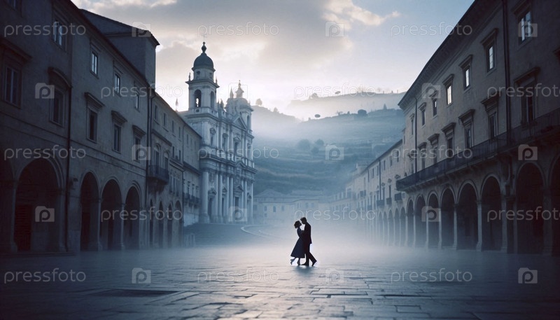 Пара, медленно танцующая посреди асфальтированной площади в небольшом европейском городке, совершенно одна на рассвете, Ai создала изображение