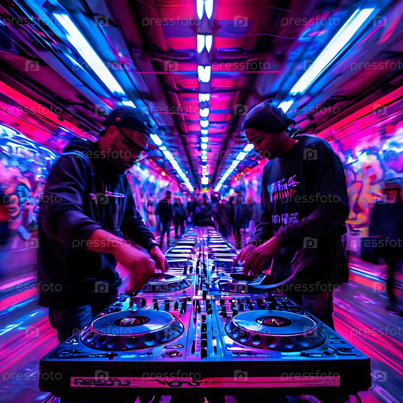 Низкоугольный снимок двух диджеев, сражающихся на портативных проигрывателях на станции метро, силуэты толпы в размытом движении. фоне неоновых граффити, отражения распыленной краски на виниле