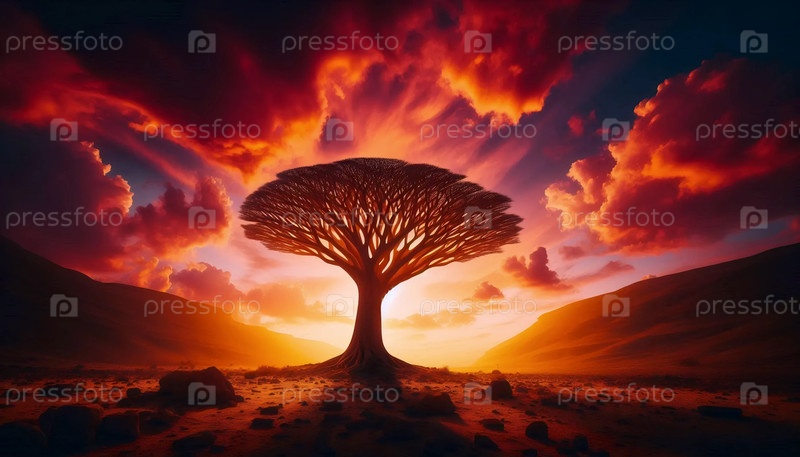 Силуэт дерева драконовой крови на закате, Ai generated image