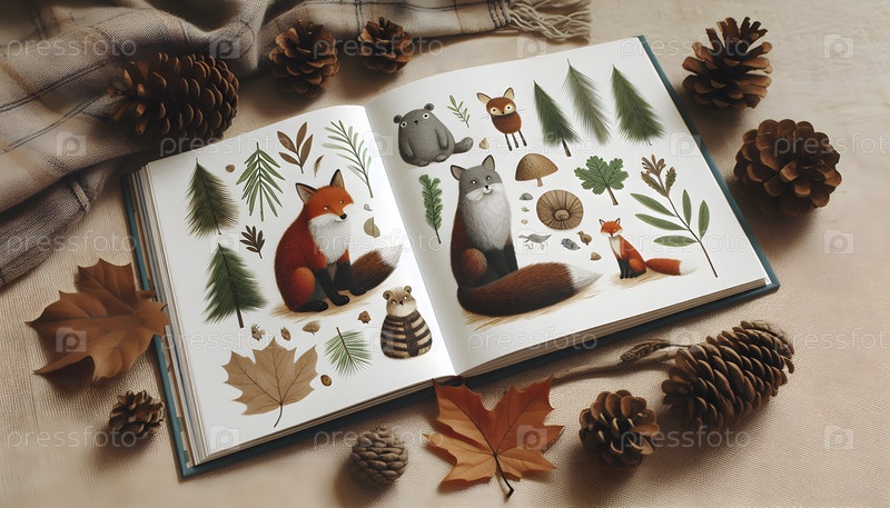 Иллюстрированная детская книга о животных, открытая на странице с лесными существами, Ai created image