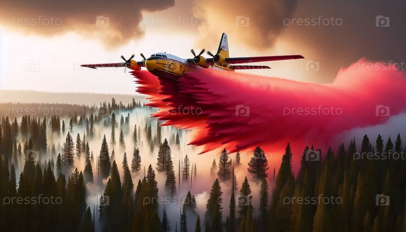 Самолет пожарной службы сбрасывает отстойник над лесом, Ai generated image