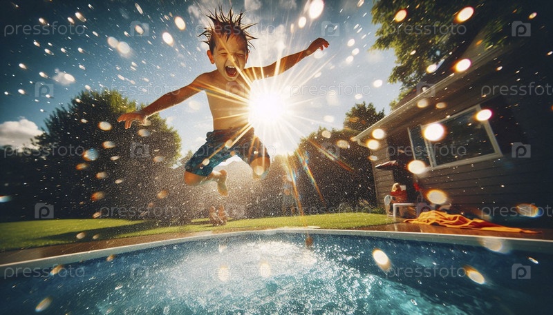 Ребенок посередине прыгает в ярко-синий надувной бассейн, огромное количество капель воды замерзло в воздухе, Ai создал изображение