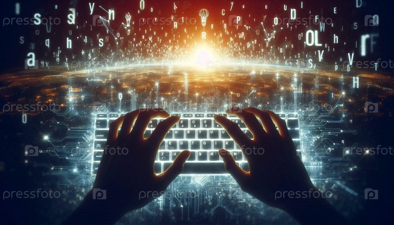 Руки, печатающие на клавиатуре в творческой атмосфере рабочего пространства, Ai generated image