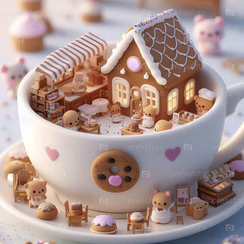 Кавайская сцена крошечной пекарни в чайной чашке, Ai generated image