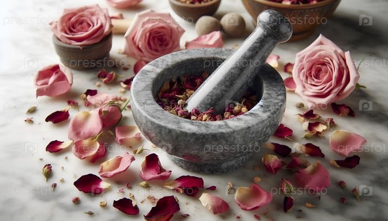 Молотком и пистолетом, измельчая сушеные листья роз в порошок, Ai created image