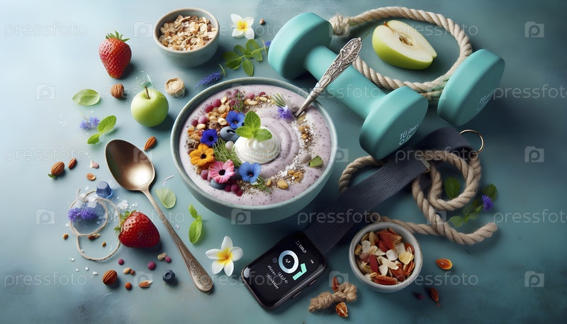 Чашка для мороженого смузи с гранолой и съедобными цветами, Ai created image