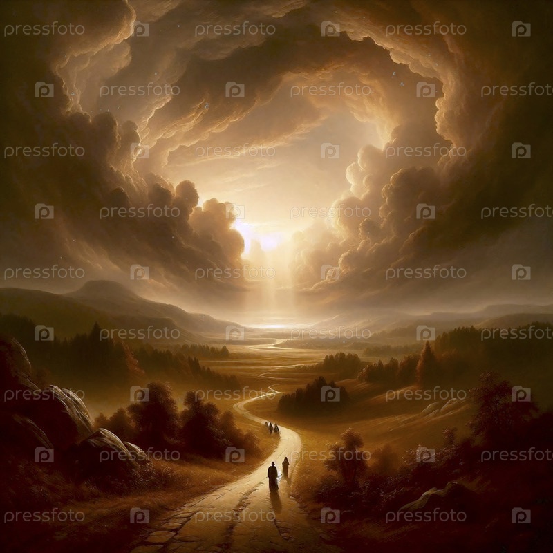 Дорога в Эммаус на закате, романтическая живопись, Ai generated image