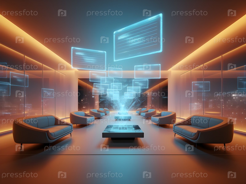 Футуристический офис, синий акцентный свет, изображение создано с использованием Ai