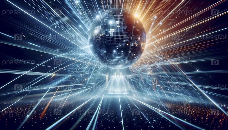 Сцена в ночном клубе с одним гигантским дискотечным шаром, отражающим красочные лазерные лучи во всех направлениях, Ai generated image