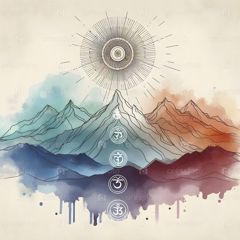 Минималистское линейное искусство горного хребта с наложенными символами чакры, Ai created image