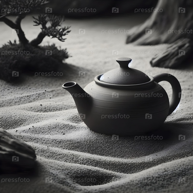 Каменный чайник, расположенный в саду с сухим песком, Aiware created image