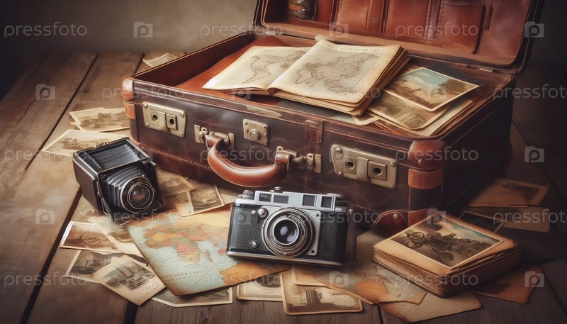 Кожаный чемодан 1950-х годов открыт, чтобы раскрыть памятники путешествий, Ai generated image
