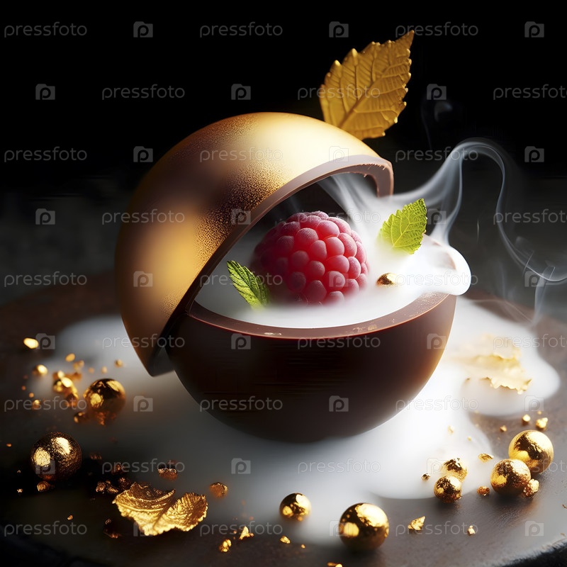 Съедобный шоколадный шар плавится под нитродым, чтобы выявить ядро малинового геля, Ai created image