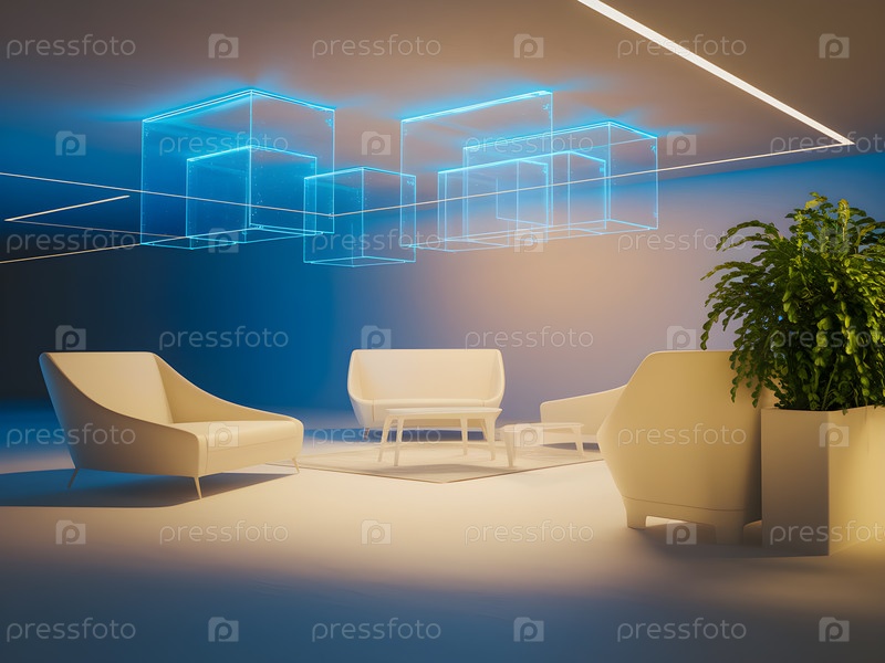 Футуристический офис, синий акцентный свет, изображение создано с использованием Ai