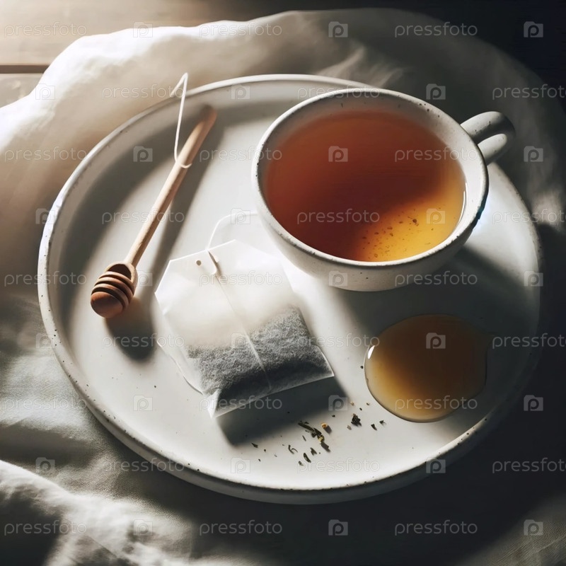 Чайный пакет на тарелке с медовой каплей, Ai generated image