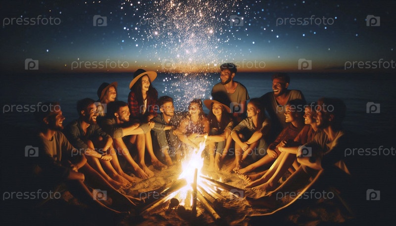Группа друзей собралась вокруг трескающего костра на темном, отдаленном пляже, их лица были освещены пламенем под звездным небом