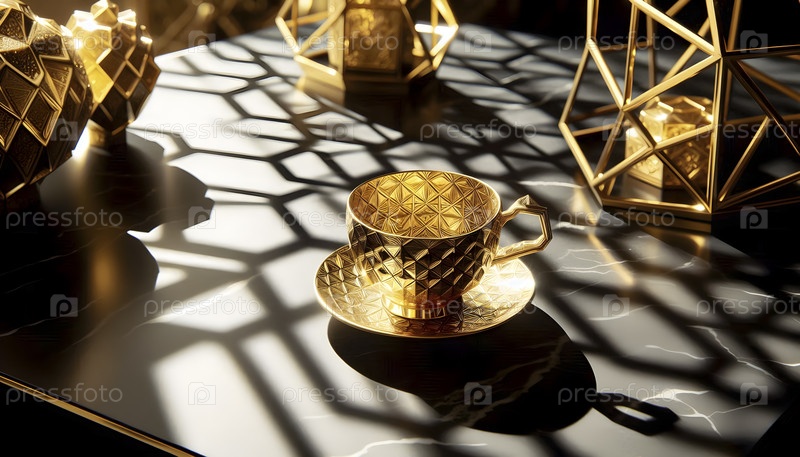 Чашка с золотыми листьями на черном мраморном столе, Ai created image