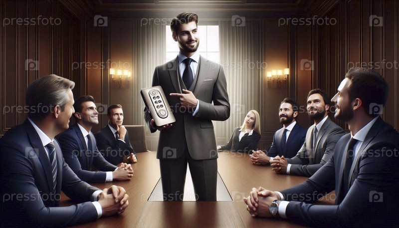 Уверенный бизнесмен в стройном костюме, демонстрирующий новую офисную диктантную машину с нажатием кнопки своим впечатленным коллегам, Ай создал образ