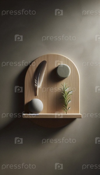 Рустичная полка с камнем, перьями и веточкой розмарина Ai создала изображение