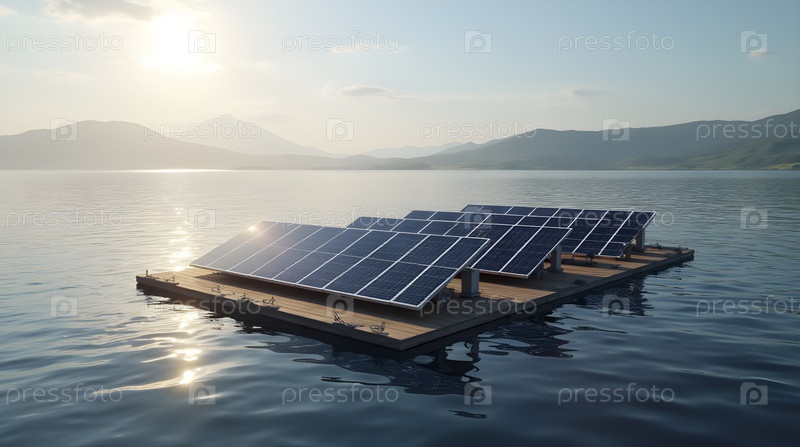 Плавучая солнечная ферма на тихом озере, Ai generated image