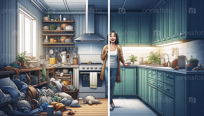 Реклама на разделенном экране, сравнивающая беспорядочную старомодную кухню с яркой современной, оснащенной новыми приборами, Ai generated image