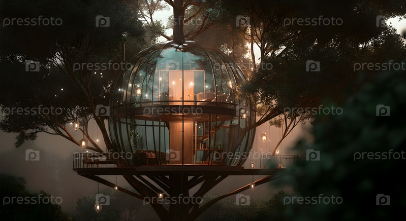 Стеклянный дом на дереве в лесу, изображение создано с помощью Ai