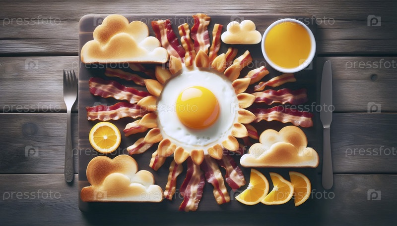 Искусство завтрака с солнечной стороной вверх яйцо как солнце, лучи бекона и облака тостов, Ai created image