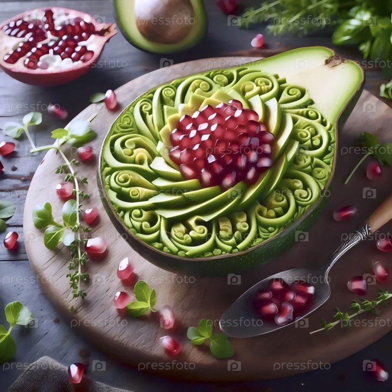 Авокадо, наполовину вырезанное в сложный цветочный дизайн с семенами граната как центром, Ai created image