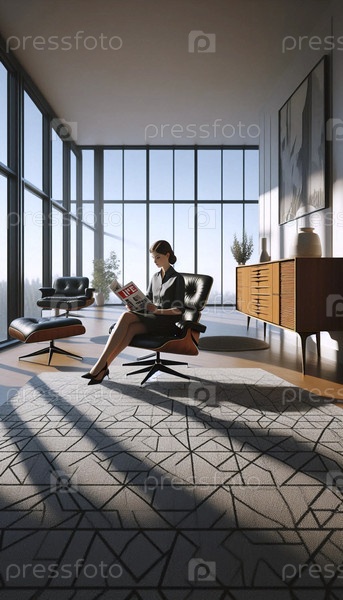 Яркая современная гостиная середины века с женщиной, читающей журнал у панорамного окна, Ai generated image