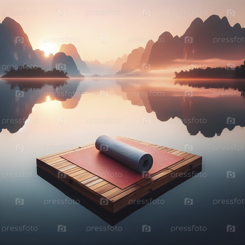 Матка для йоги, плавающая на спокойной поверхности озера на рассвете, Ai created image