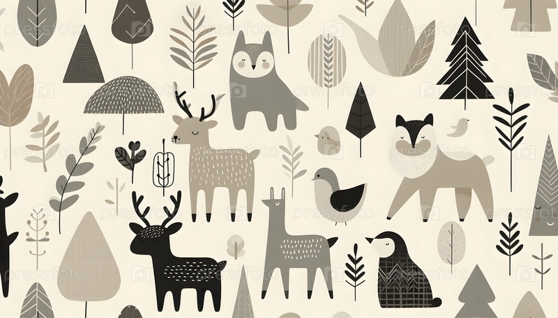 Скандинавские минималистические силуэты животных детская комната обои, Ai created image