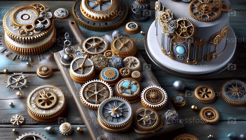 Дисертационное искусство, вдохновленное стемпанком с использованием печенья в форме коробки передач и тортов с металлической пылью, Ai created image