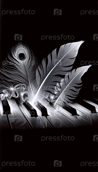 Фотограммная композиция рассеянных клавиш фортепиано и перьев на световом столе, Ай создала изображение