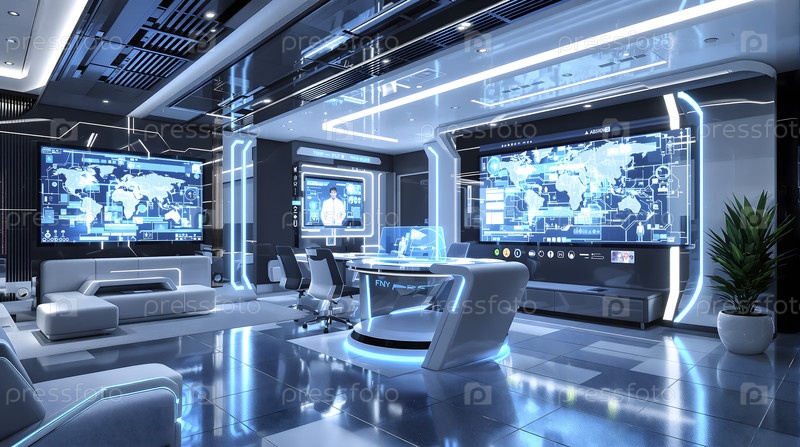 Футуристический офис, синий акцентный свет, изображение создано с использованием Ai